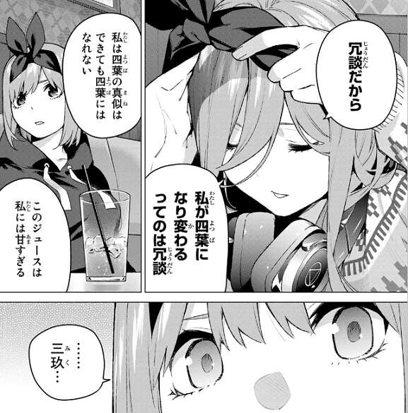 二人とも無言でいると、三玖が急に海での話の続きを始めて、四葉になり変わるってのは冗談だと言います。私は四葉の真似はできても四葉にはなれない、このジュースは私には甘すぎると三玖は四葉に話します。その後せっかくだし歌おうと三玖が言い、四葉も賛成します。二人が偶然にも選んだ歌は、二乃が家でしつこいくらい聴いていた曲、ラブ☆バケーションでした。