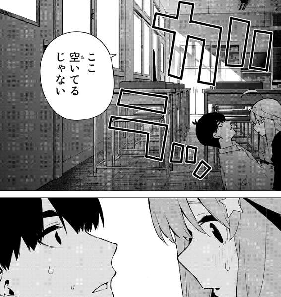 二乃と四葉が突然教室に入って来て話を始めたので、二人に見つかったらまずいと隠れる五月です。五月は二人っきりでいるところを見られて誤解されたらまずいと動揺しますが、風太郎は冷静に五月に落ち着くように言います。