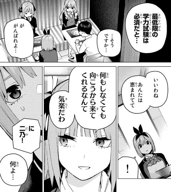 五月と風太郎は体育大学なら四葉にぴったりだと喜びますが、四葉は最低限の学力試験は必須だとの条件があると言います。それを聞いた風太郎は、がんばれよ…、と返すのが精一杯です。その話を聞いていた二乃が何もしなくても向こうから来てくれるなんて、気楽だわ、と四葉に厳しい物言いをします。そして進路の話から元の四葉が話したかった話題に二乃は戻そうとしますが、不穏な雰囲気を察して五月は二乃を強引に教室に連れていきます。残された風太郎と四葉ですが、四葉も二乃を追いかけて行ってしまいます。