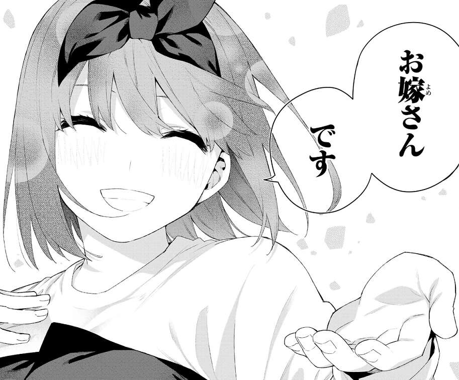 最後は、四葉もお嫁さんに小さい頃に憧れていたという事で、風太郎のプロポーズに応えます。これで、まだ付き合っていなかった二人ですが正式に付き合い始めたので、後は結婚式を残すのみでしょうか(まだ鐘キスとか残っているので、分からない部分もありますが)。