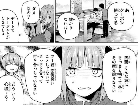さらに風太郎はクーポンを使い始め、二乃の文句が追加されます。先日、風太郎は四葉の覚悟を聞いてしまっただけに容易に踏み出すことが出来ず、お互いそれが分かっているから、ぎこちないと一花は言います。