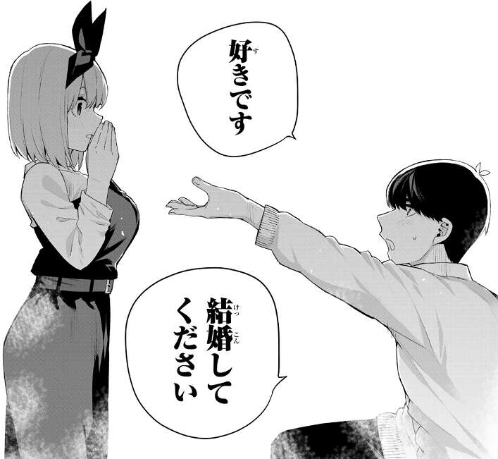 そして風太郎は四葉に手を差し出し、好きです、結婚してください、といきなり四葉にプロポーズをします。