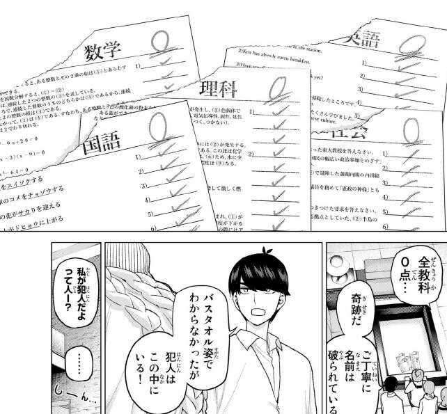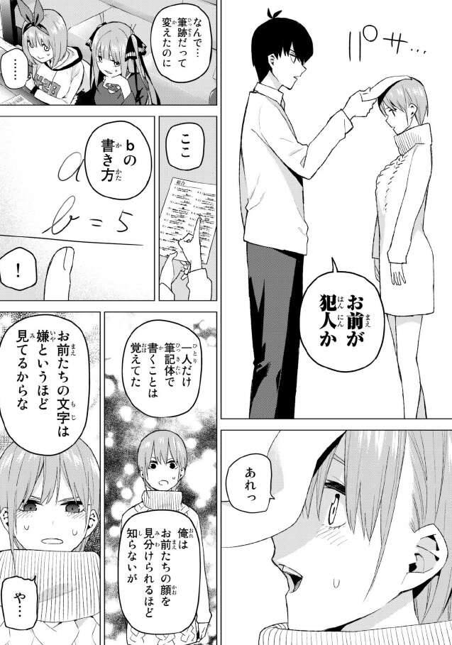 しかし風太郎には犯人だとばれてしまいます。いままでさんざん勉強を見てきて五つ子の文字は嫌という程見てきています。