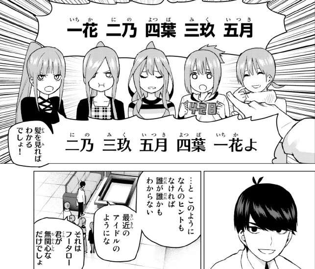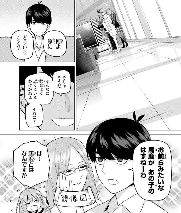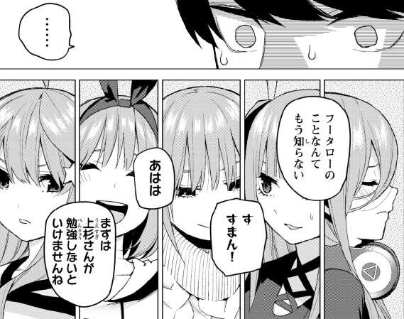 先週、風太郎の小学生時代の思い出と写真の女の子の正体が分かりそうでしたが、結局五つ子達のアホさ故に分からずじまいになってしまいました。「お前らみたいな馬鹿があの子のはずねーわ」と勉強をみっちりふくしゅうしますが、五月?からは「わざと間違えている?」とかまかけられていますね。