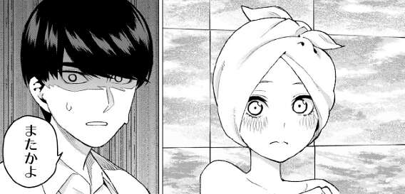 風太郎は話題を変えてほんの10分前のことです。風太郎はオートロックも使いこなせてきたようですが、玄関を入ると何故か五つ子の誰かがバスタオル姿でいます。風太郎は荷物を投げつけられ、「変態!」と罵られてしまいます。
