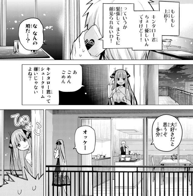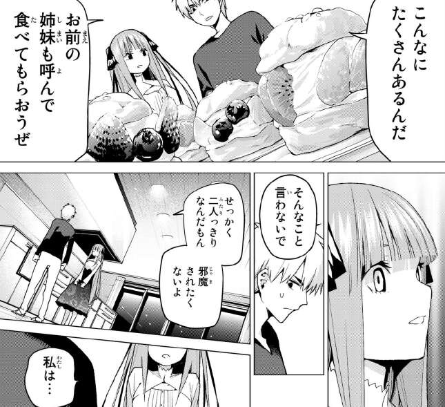 沢山作ったので、他の姉妹も呼ぼうと言いますが二乃は2人っきりを邪魔されたくないと言います。