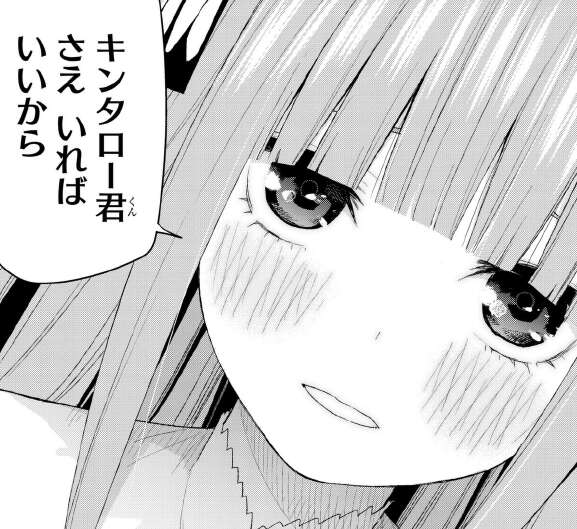 二乃の悩みを払拭すべく、キンタローとして二乃の部屋に来た風太郎です。ちゃんと誤解を解かないと、と思いつつ風太郎は流されていくのです。