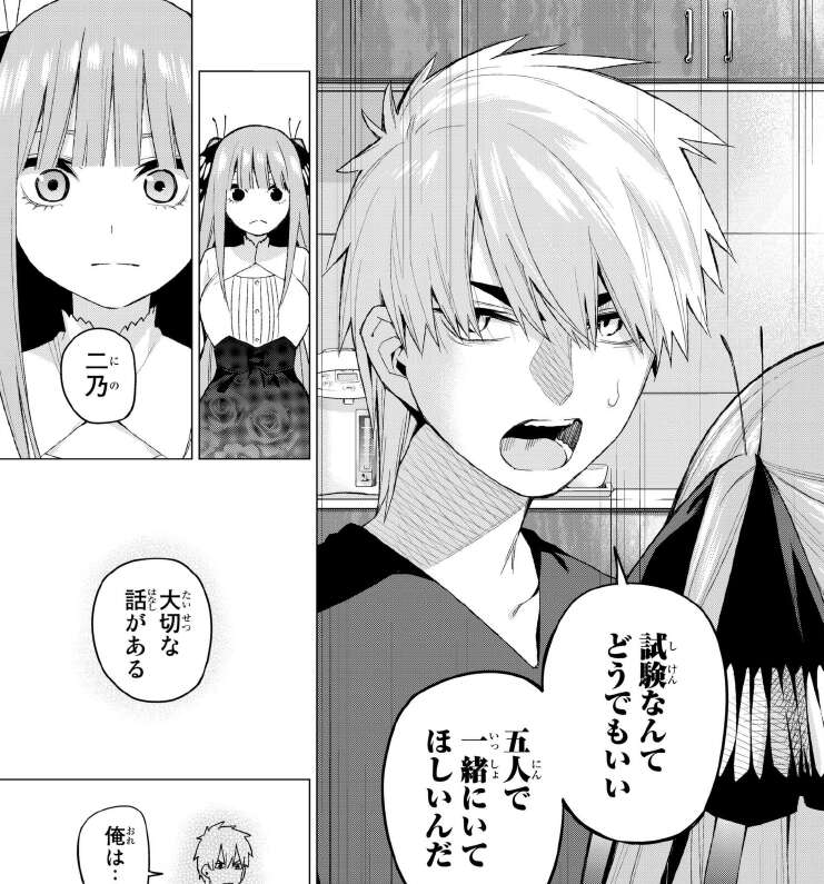 二乃はキンタロー君さえればいいと言います。同時に風太郎は試験にこだわっていると言いますが、風太郎は否定します。