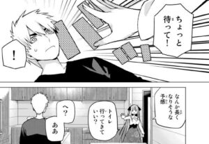 二乃が泊まっている部屋にお邪魔した風太郎ですが、何故か二乃とキンタロー君を合わせる事になりました。