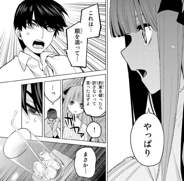 ここで二乃から一旦中断されてしまいます。戸惑いながらも、渋々従う風太郎です。そして二乃から呼び出されて1階のカフェに呼び出されます。