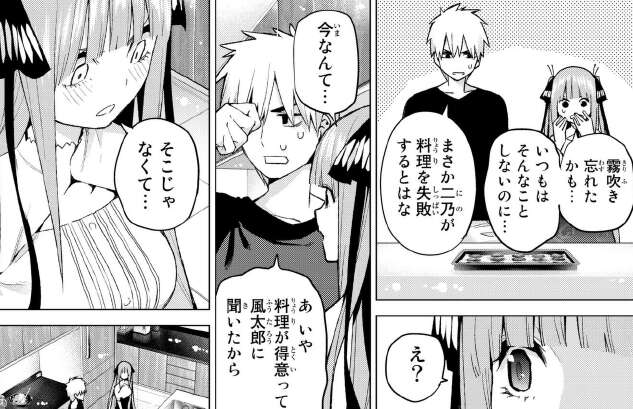 お菓子作りに失敗してしまいました。動揺する二乃をフォローする風太郎ですが、二乃としては嬉しかったようです。
