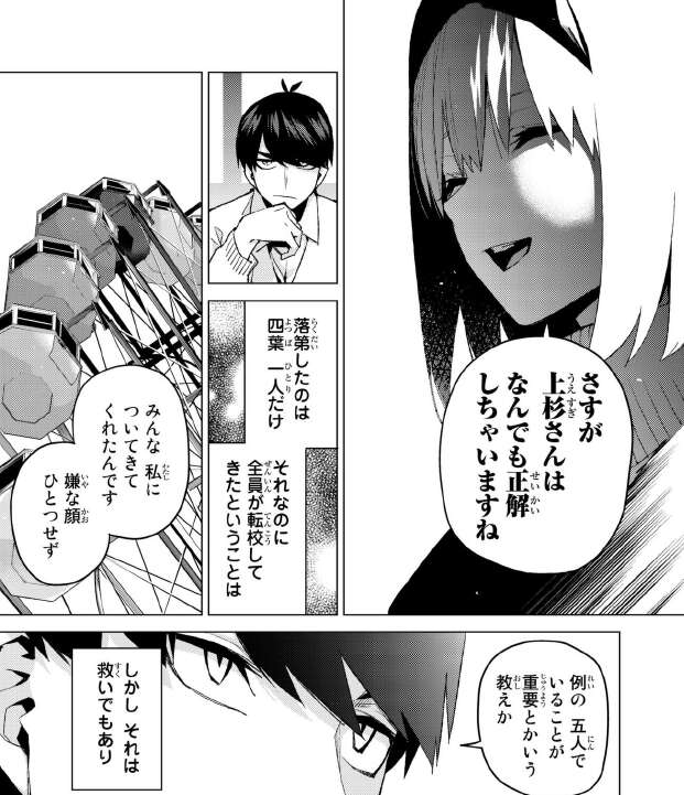 四葉は一人、観覧車で遊ばずに勉強をしていましたが、風太郎はせっかくの休日なので休みように言います。そこで四葉は自分が、1人だけ勉強していた理由、転校してきた理由を話します。