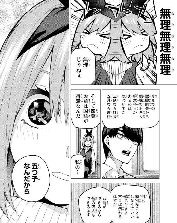 五つ子たちに勉強を教えるのに苦労していた風太郎ですが、やっと香料が見えてきたと言って、四葉に他の姉妹に国語を自分と一緒に教えてやってほしいと言います。