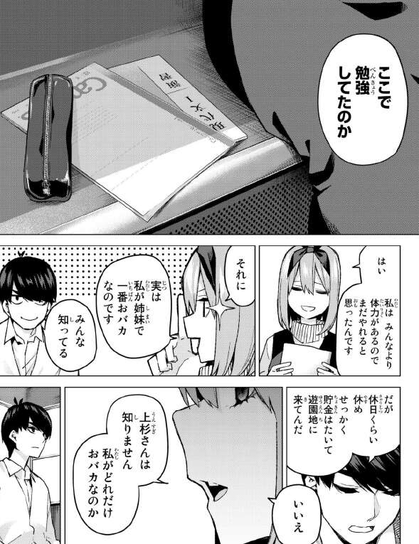 場面戻って、試験まで二ケ月の時期ですが四葉以外何となく気合が入っておらず、残り一カ月を切っても、風太郎が勉強を教えても何となく進みが遅いです。