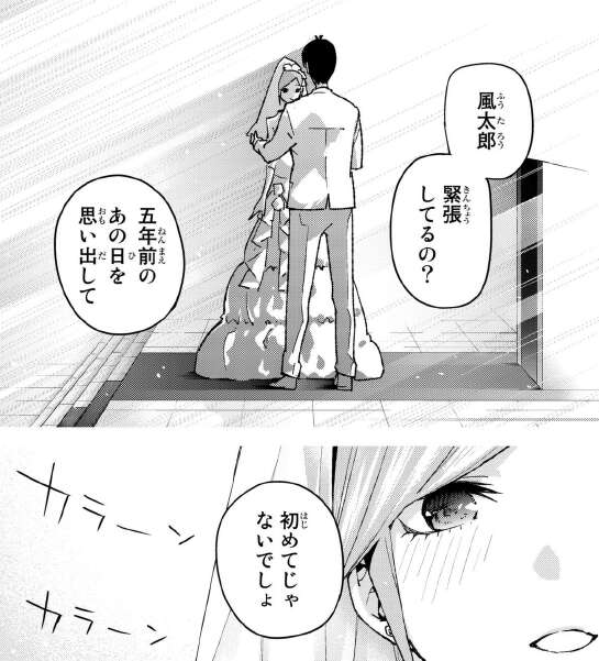 先週で二乃が再告白をして風太郎にきちんと好きだと伝えましたが、今週は結婚式当時の日に再び戻って、風太郎と未来の花嫁の会話から始まります。緊張している風太郎に、五年前のあの日を思い出してと言っています。