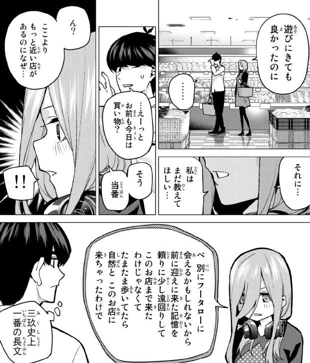 三玖も買い物に来ていたそうですが、風太郎が五つ子の家にもっと近い店があるのになぜ、と質問すると、動揺しまくった三玖が長文の言い訳を話し始めます。