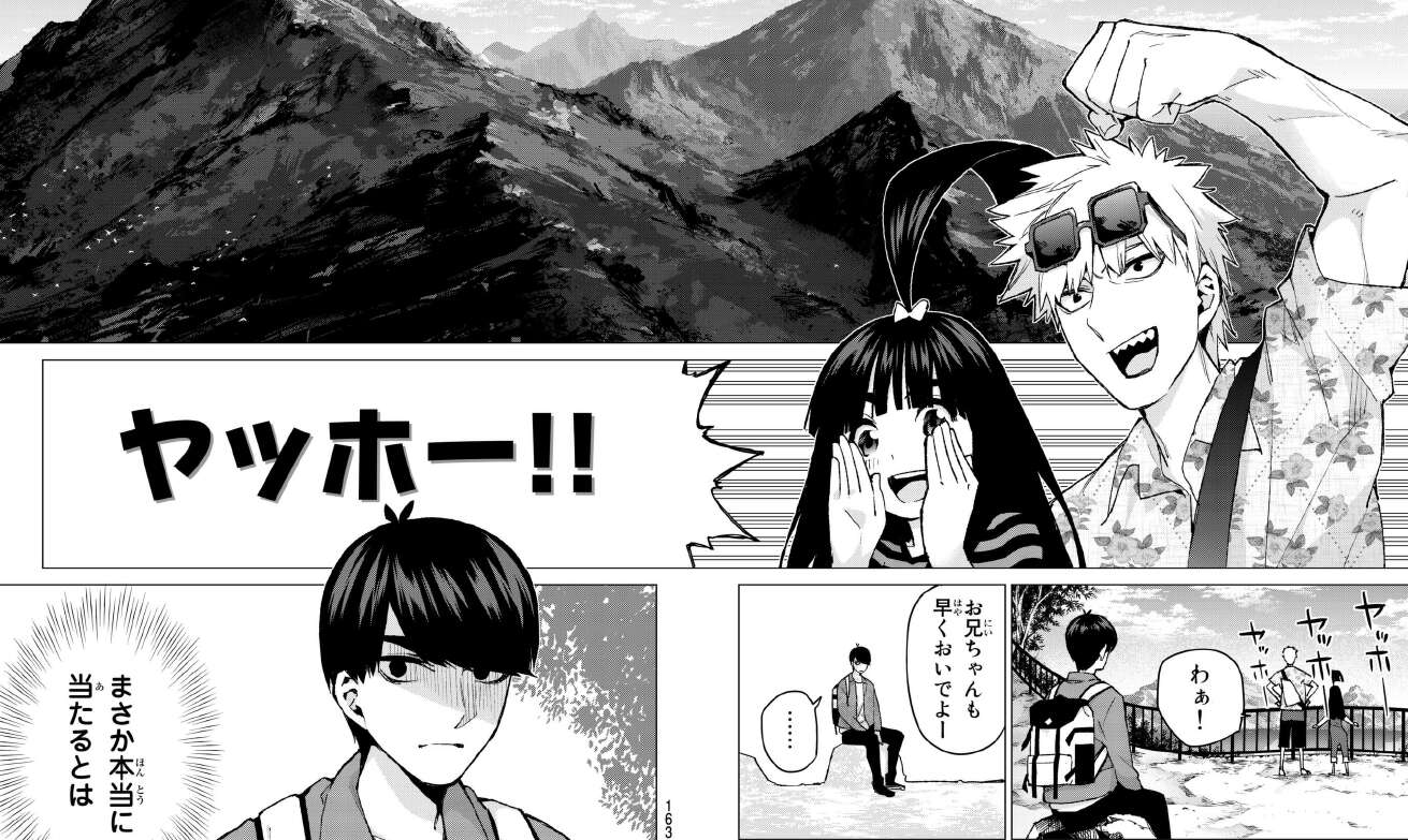 二乃の告白の事は一旦忘れて、今はこの家族旅行を楽しもうと考えていた矢先、何故か五月がいます。見事にヤッホーのかけ声もかぶります。そしてその後から、四葉たちも来ていて…。
