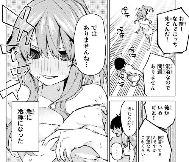 それを聞いて嬉しくなった五月も風太郎がいる混浴に入っていきます。最初は友達なら混浴も当たり前と言っていましたが、急に冷静になり恥ずかしがり出します。