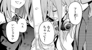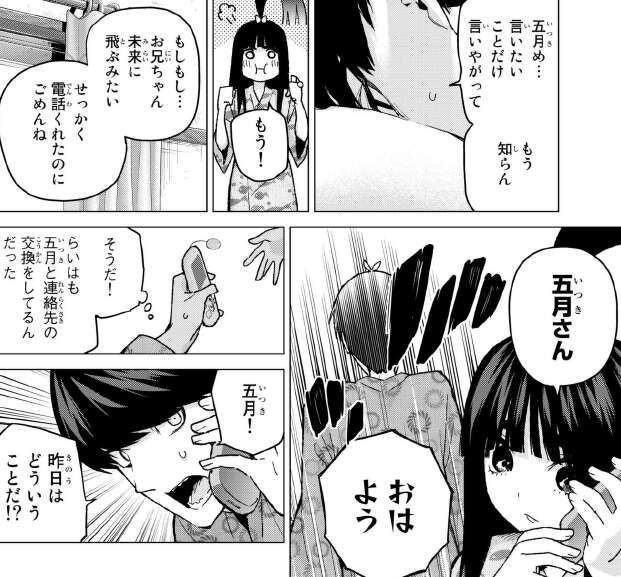 五月曰く、風太郎が昨日中庭に何故か来ていなかったことになっていて、風太郎に理由を問いただしています。中野パパの監視の目もあり五月が困っていると、風太郎は意外な場所を提案します。