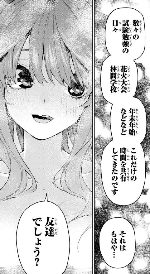 五月は既に私たちはパートナーではなく、多くの時間を共有した友達でしょうと言います。それを聞いて風太郎は照れながらも、五月の提案通り他の五つ子の悩みを突き止める、お悩み相談をやると決めます。