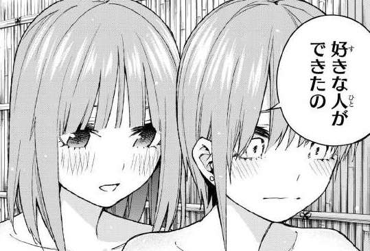 その後、一花は二乃になんで私だけ温泉に誘ったのか尋ねると、告白の事を聞きたくなったと言います。そして二乃は他の子には言えないと言い、好きな人が出来た事を一花に告白します。