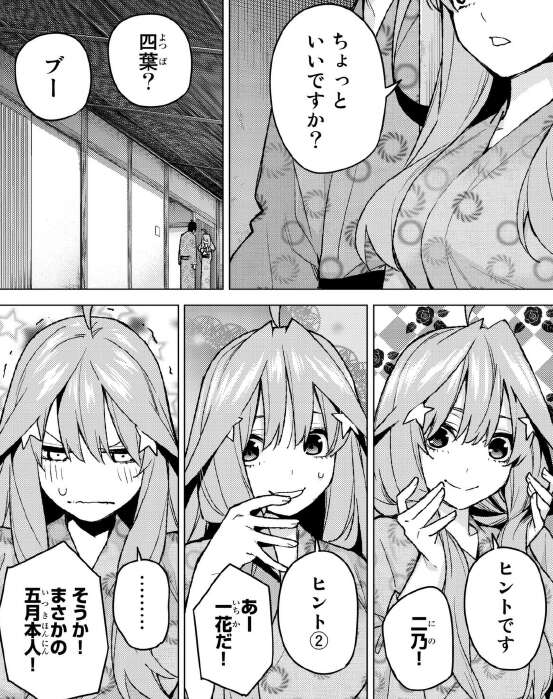 しかし、「なんで 全員五月の変装なんてしてんだ?」という質問をすると四人目の五月は、分かりやすい反応を見せ始めます。全員同じ恰好をしている理由は、お爺ちゃんを喜ばせる為だったようです。ちなみに四人目、四葉で確定ですね。