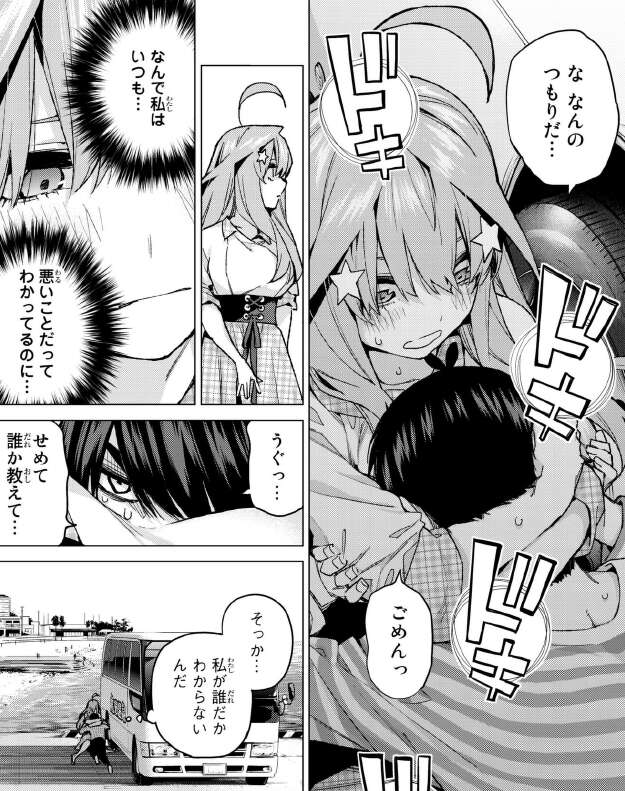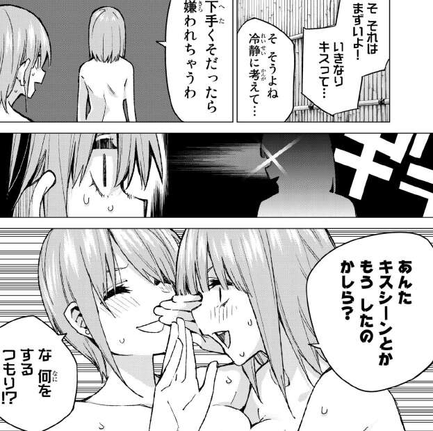 さらに告白だけでは足りないと、キスもすると言いだし、一花が止めると下手くそだと嫌われると言いだします。そして、一花にキスシーンはもうしたかと言いだし、一花をキスの練習台にしようとします。一花は姉妹だからと、なんとか二乃を止めます。