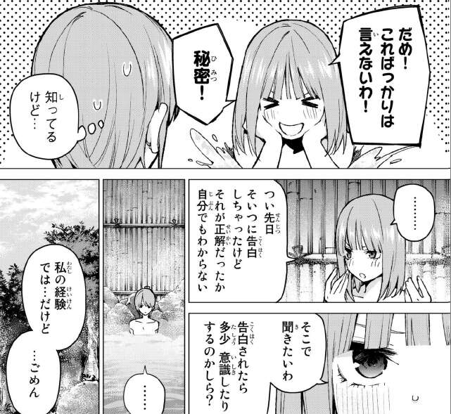 二乃は告白に関してはしたけど、それが正解か自分で分からないため、一花に告白されたら相手の心境がどう変化するかアドバイスを求めます。