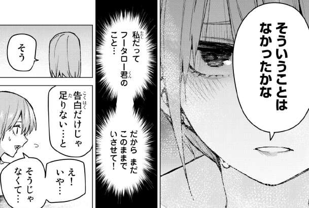ここで一花は告白されたとしても、意識する事はなかったと言いますが、内心は風太郎の事をまだ諦めたくないと思っています。すると二乃は告白だけでは足りないと、言いだします。ここの、一花怖いです。
