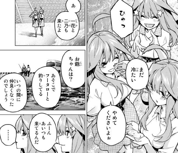 場面変わって海岸で遊んでいる三玖、四葉、五月を風太郎と五つ子のお爺ちゃんが眺めています。