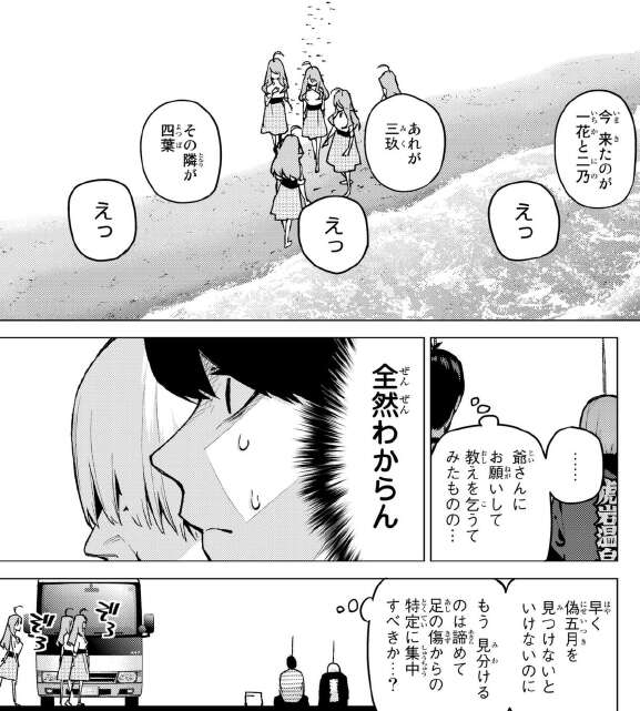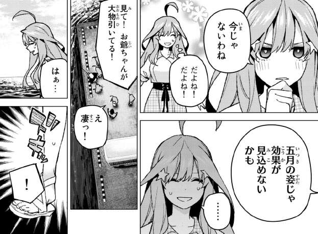 が、結局二乃が近づいてきて風太郎は海に落とす事で、二乃を風太郎から隠します。結局二乃は、夜に抜け出して風太郎の所に会いに行くと言い、一花に手伝ってほしいと言います。五つ子のお父さんがネックなので、もし五つ子のお父さんが来そうになったら足止めして欲しいと言います。