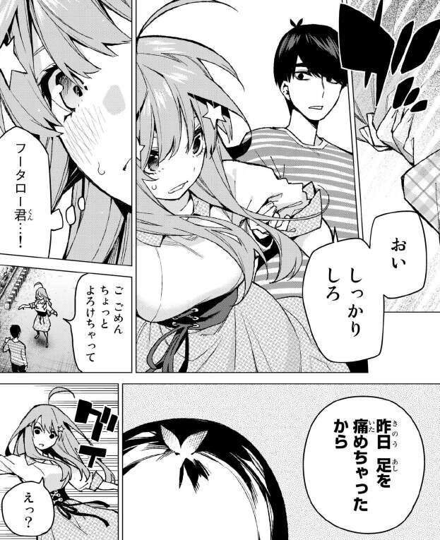 その時よろけた一花を風太郎が支えますが、昨日足を痛めたと聞いて風太郎はこの五月の姿をした五つ子が誰か聞き出そうとします。