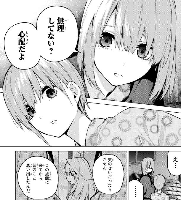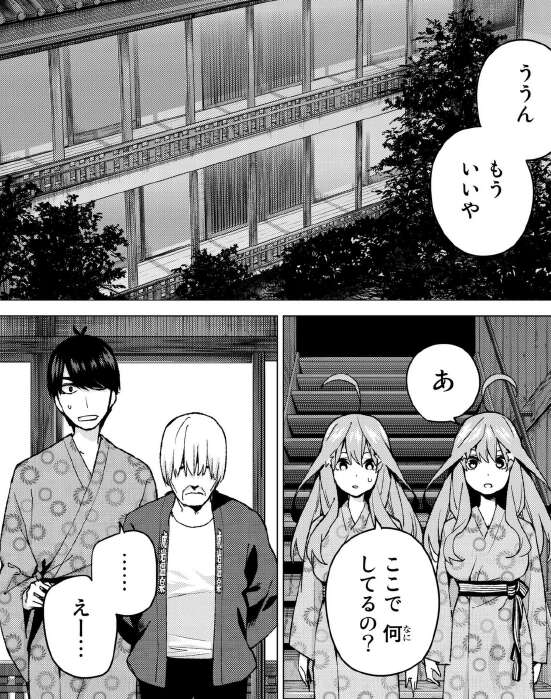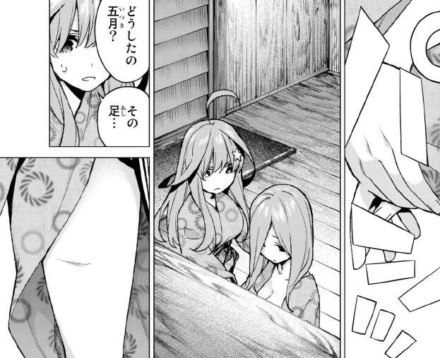 風太郎はお爺ちゃんから、何のために孫を見分けたいんだと言われます。そして、三玖と五月が温泉に入るとき、五月は三玖の足の傷を見つけます。