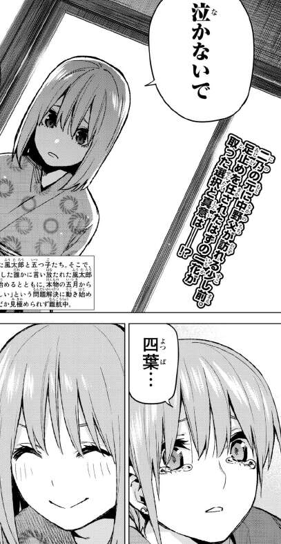 二乃から風太郎に告白すると言われ動転してしまい、つい泣いてしまった一花ですが、四葉が一花に声をかけます。