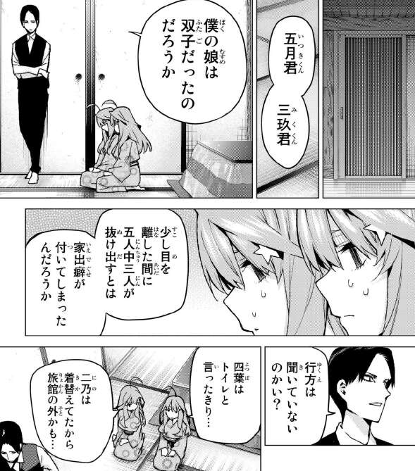 さらに場面変わって三玖と五月の二人は、五つ子の父親に捕まって説教をうけています。父親は他の五つ子たちを探しに行き、この隙に三玖と五月は温泉に入りに行きます。