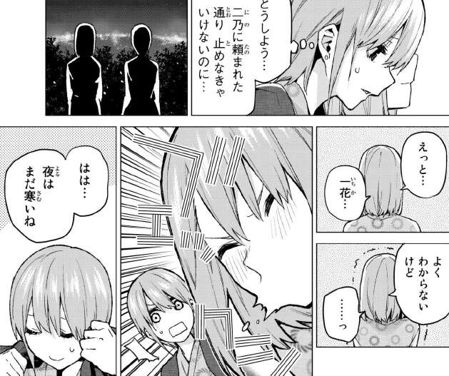 どうしようと悩みますが四葉が風邪をひきそうなので、お姉ちゃんらしく、四葉に上着を着せます。四葉にお礼を言って父親を足止めしようとすると、四葉から無理をしていないかと言われます。