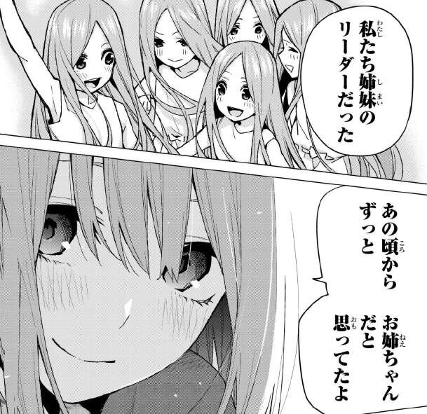 四葉から一花だけなんで大人になれたんだろと言われて、母親が亡くなった後の痛々しい五月の姿を見たらお姉ちゃんらしくしないと、と思ったそうです。