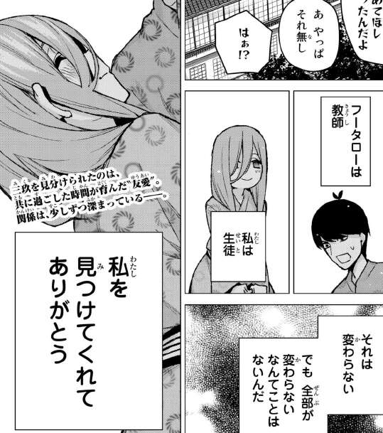 三玖は風太郎には家庭教師を辞めて欲しかった理由は、結局離しませんでした。しかし、2人の教師と生徒と言う関係は変わらなくても、全てが変わらない事はなく、少しずつ変わっている事を感じ、風太郎にありがとうと心の中で呟きます。