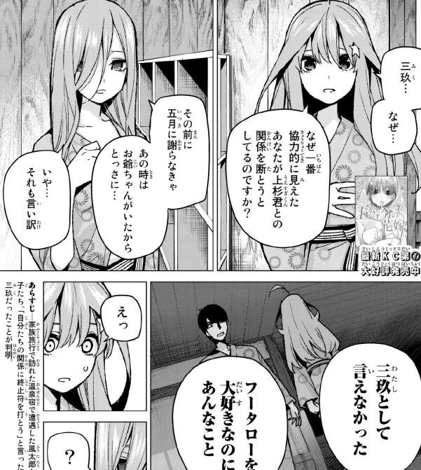 前回、三玖が偽五月で風太郎に関係を断つと伝えた本人だと判明しましたが、五月は何故三玖がそんな事を言ったか、尋ねます。