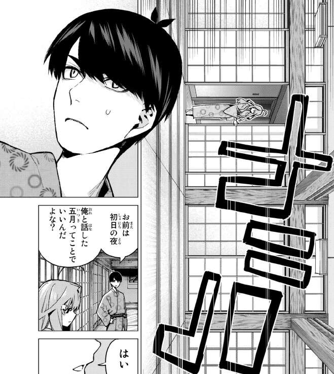 風太郎はお爺ちゃんから言われた、仕草、声、ふとした癖でなくこんな方法でしか判別できなかった事に引っかかり、偽五月の後姿をもう一度じっと見ます。