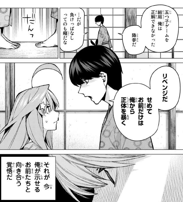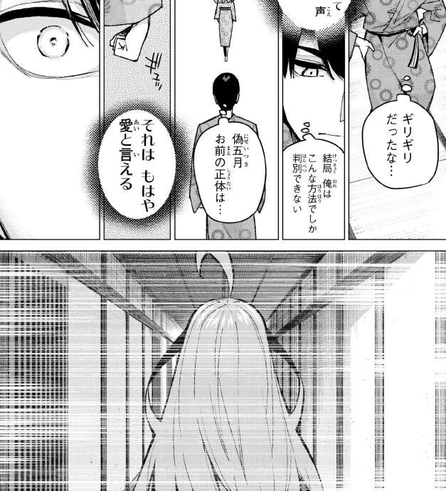 風太郎は五つ子ゲームを正解できませんでしたが、せめて最後に偽五月の正体だけでも暴くことが、風太郎が示せる五つ子たちと向き合う覚悟だと考えます。風太郎は四葉、二乃の悩みの内容から偽五月はないと当てられました。
