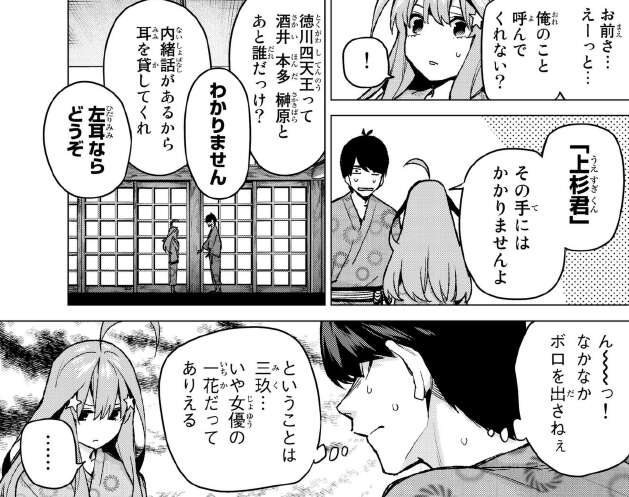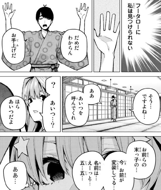これで正体が一花か三玖に絞られましたが、ここから風太郎は全く見分けがつかず、とりあえず三玖が言いそうなこと、知っていいそうなことを言って特定しようとしますが、三玖は引っかかりません。