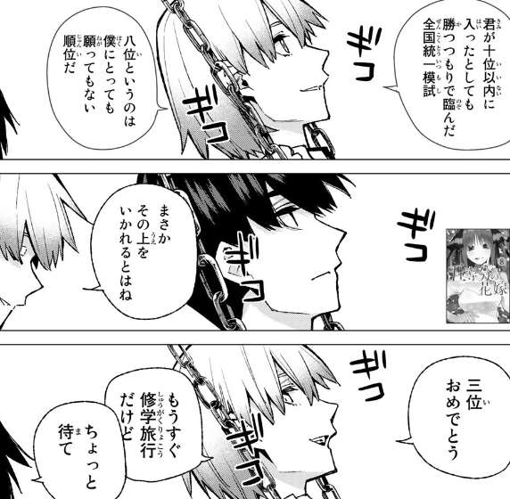 全国統一模試で、風太郎は見事三位、武田も全国八位とお互い好成績を収めました。その二人が何故か公園でブランコに乗って、全国統一模試の結果を振り返っています。