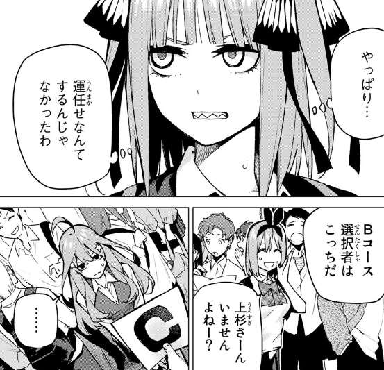 そして修学旅行最終日、二乃はAコース、四葉はBコース、五月はCコースを選択し、風太郎とは別のコースになってしまいます。