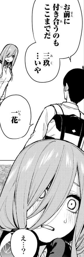 懲りたかと思った一花ですが、最終日のコース選択でも何か企んでいそうです。しかし、Eコースで風太郎と一緒になったのは、三玖だったのでこのまま素直に三玖と最終日を過ごすのでしょうか。今までの空気から、まだ波乱がありそうですが。