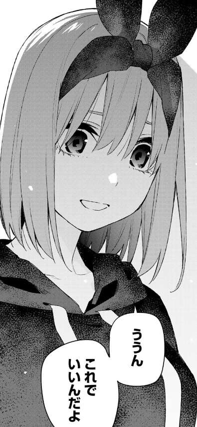 三玖は二乃たちに裏からフォローしてくれた事に礼を言い、一花にも礼を言おうとしますが一花は三玖に改めて謝罪をします。三玖もいいよと言って、恋ってこんなに辛いんだねと呟きます。