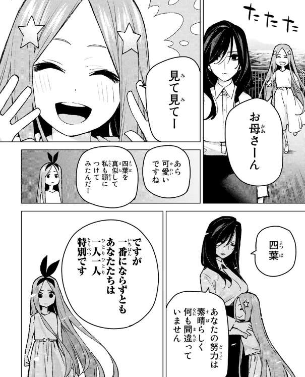 そこに五月が母親の元に走ってきて、四葉の真似をして五月も頭に星形の髪飾りを付けたと母親に髪飾りを見せに来ます。またしても四葉は複雑な表情をしますが、母親は四葉の努力は素晴らしく何も間違っていないと肯定しつつも、一番にならずともあなたたちは一人一人特別ですと言い、母親は五つ子たちに一緒にいて欲しいと願っている、たとえどんなことがあったとしても五人でいて欲しいと願います。