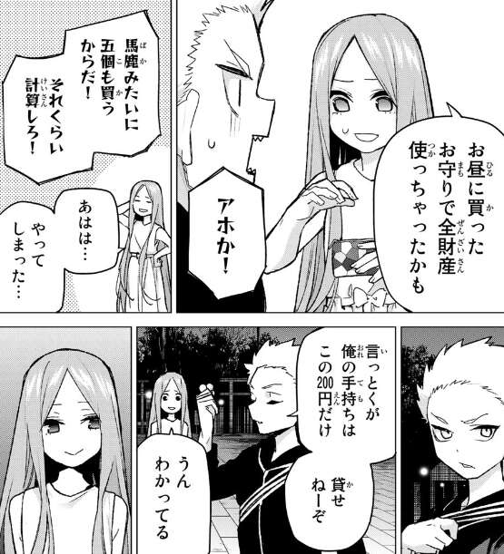 過去の思い出話であったように、風太郎と四葉はお守りを買いましたが京都観光に夢中だったため、気がつくと既に夜です。しかもお昼に買った5個分のお守り代金のせいで、四葉は全財産を使いきってしまいバスで帰ることも出来ません。風太郎は200円しか持っていないから、四葉の分は出せないため自分だけバスでかえると言いますが、そのお金を何故かお賽銭に使ってしまいます。