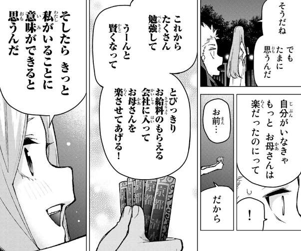 風太郎の行動にあきれる四葉ですが、風太郎の家が貧乏と分かりお金が無くて辛くないかと質問します。五つ子たちもこの頃は母親一人で五人を育てていて貧乏ですが、四葉はお金がないのは辛くないが母親が一人働いている姿を見るのは辛いと言います。そして自分がいなければもっと楽だったのにとも四葉は言い、だからこれからはたくさん勉強して賢くなっていいお給料の会社に入って母親を楽にさせてあげる、そうすればきっと私がいることに意味ができると思うんだと四葉は言います。