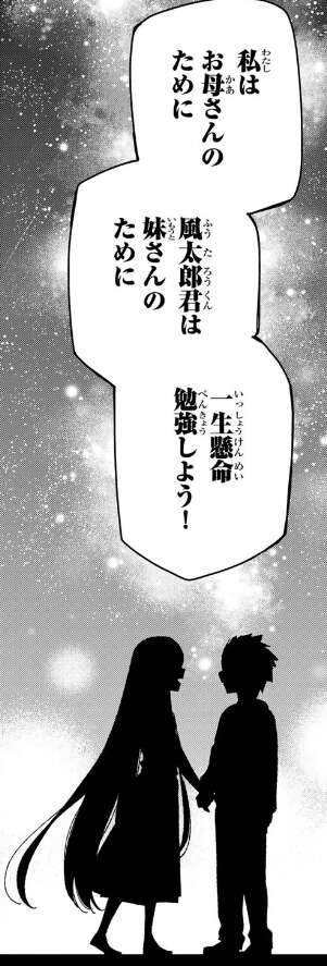 四葉の考え方に感心して共感した風太郎は自分も妹の為に、めっちゃ勉強して頭よくなってお金を稼げるようになり、妹に何不自由ない暮らしをさせたい、必要ある人間になれるかもと言います。四葉は感動したのか風太郎の手を握り、二人で頑張ろうと誓います。